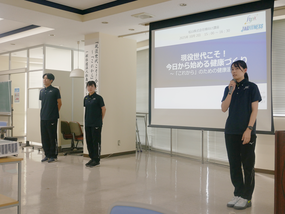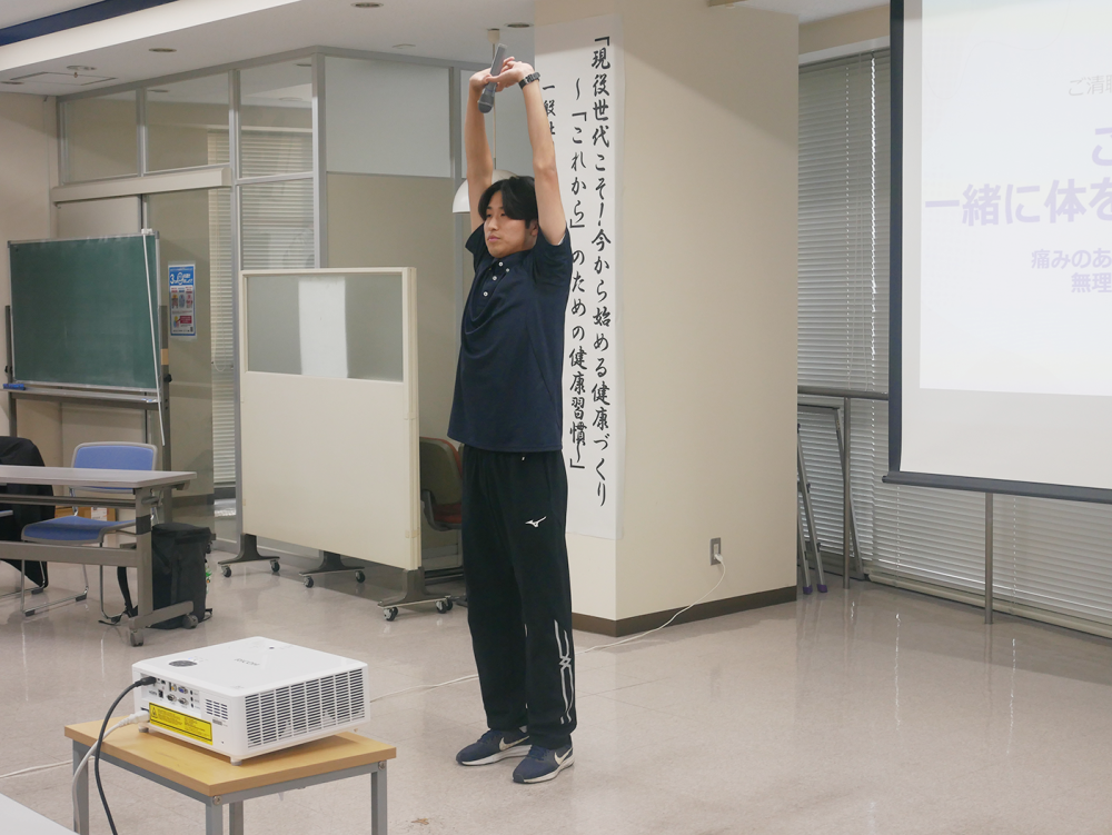 講話では、オフィスでも手軽にできるストレッチや、自宅で無理なく続けられる筋力トレーニングなど、具体的なエクササイズを実演を交えながら指導していただきました。
