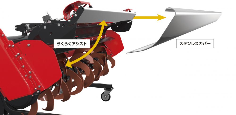 - 耕うん部カバー内側・側板・均平板下部にステンレスを装着し土の付着が少ない。また、均平板下部のステンレスカバーも交換可能になり、厚さも従来より1.5倍で耐久性が向上。