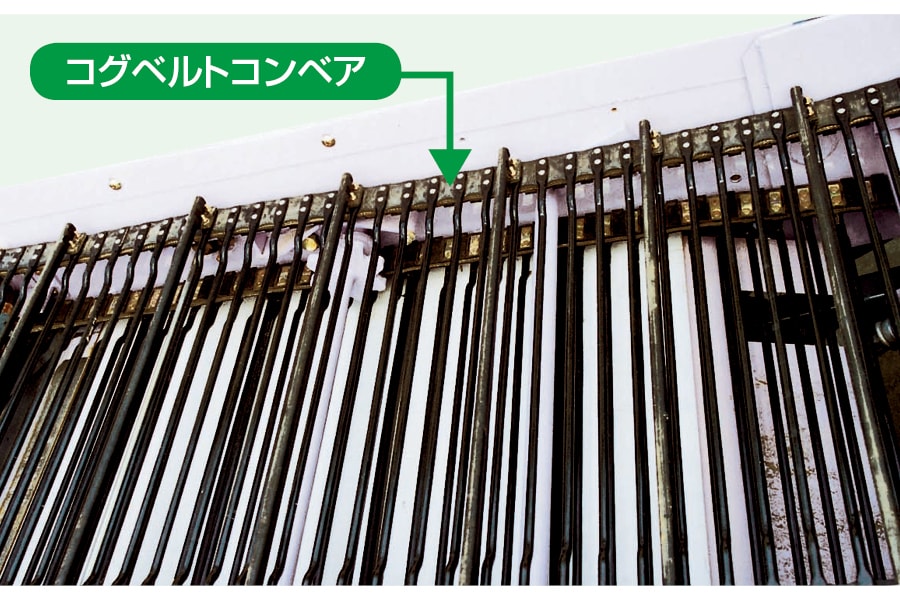 耐久性に優れた「コグベルトコンベア」が静かにイモのころがりを抑えながら運びます。
