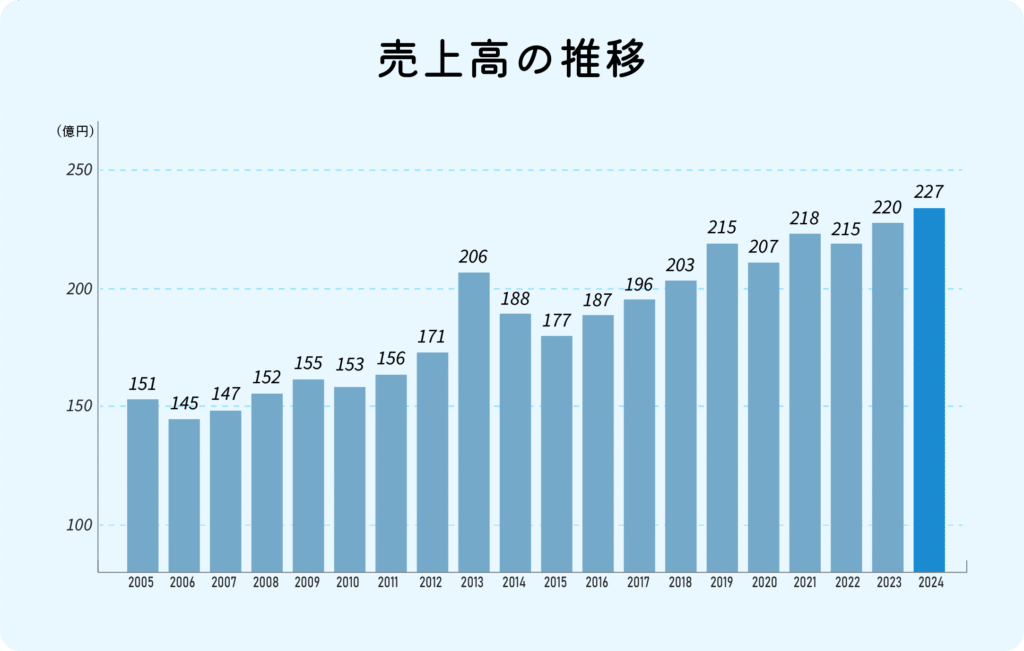 2005年以降、多少の上下はあるものの、概ね右肩上がりの売上高。2025年以降も順調な成長が見込まれています