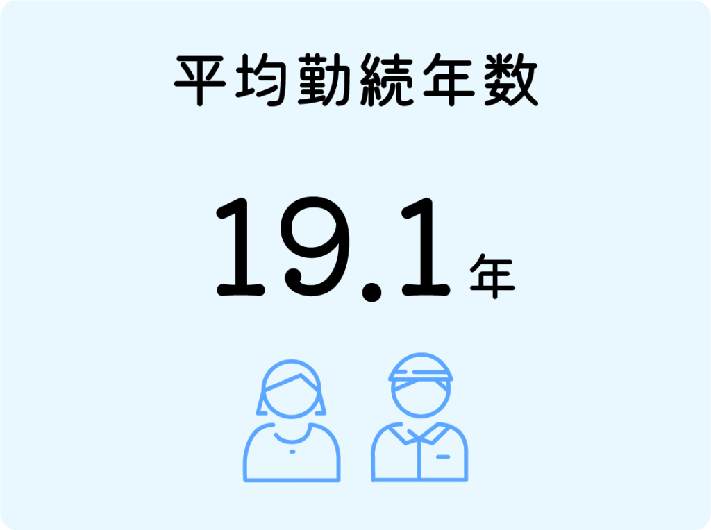 当社の平均勤続年数は19.1年。2023年の国税庁の調査によると日本の企業全体の平均勤続年数は12.5年ですので、当社は他者と比較しても、働きやすい環境と言えそうです。