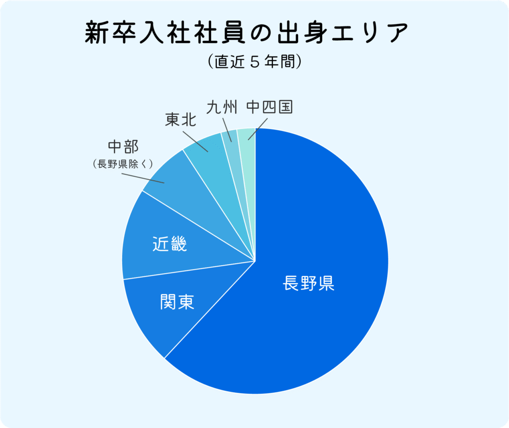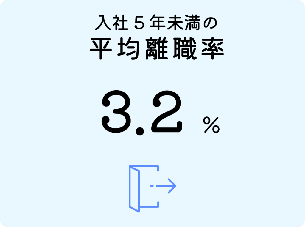 入社5年未満の平均離職率は3.2%です。ほとんど離職者が出ないのも当社の強みの1つです。新卒から長く働く社員が多いので、会社の文化が育ちやすいと言えます。