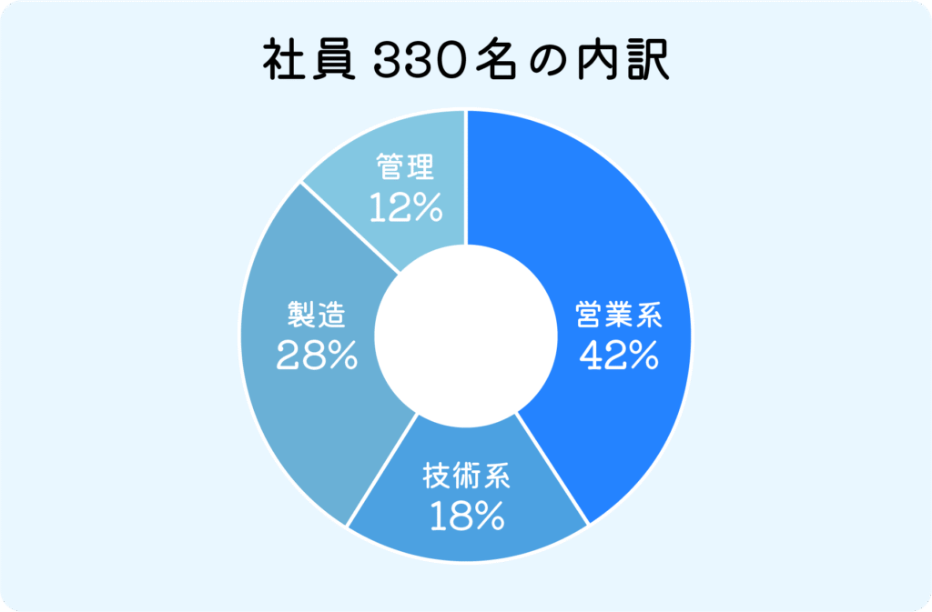 当社の社員数はで330名です。内訳は営業系職種(営業、営業事務など)が最も多く42%を占めます。技術系職種(開発、生産技術、設備)18%、製造職28%、管理部門(総務・経理など)12%になっています。