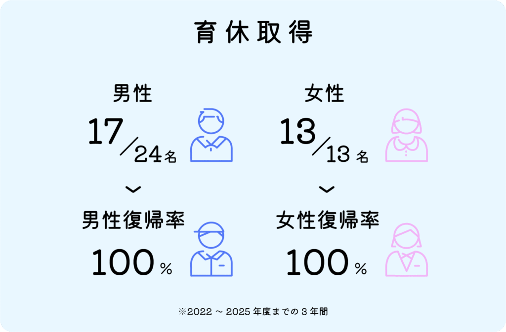 当社3年間の育休取得資格者は32名(男性22名、女性10名)でした。女性はもちろん100%取得ですが、男性の取得率も70.8%まで上がってきました。今後はこの数字を上げていくことが、会社全体の目標にもなっています。